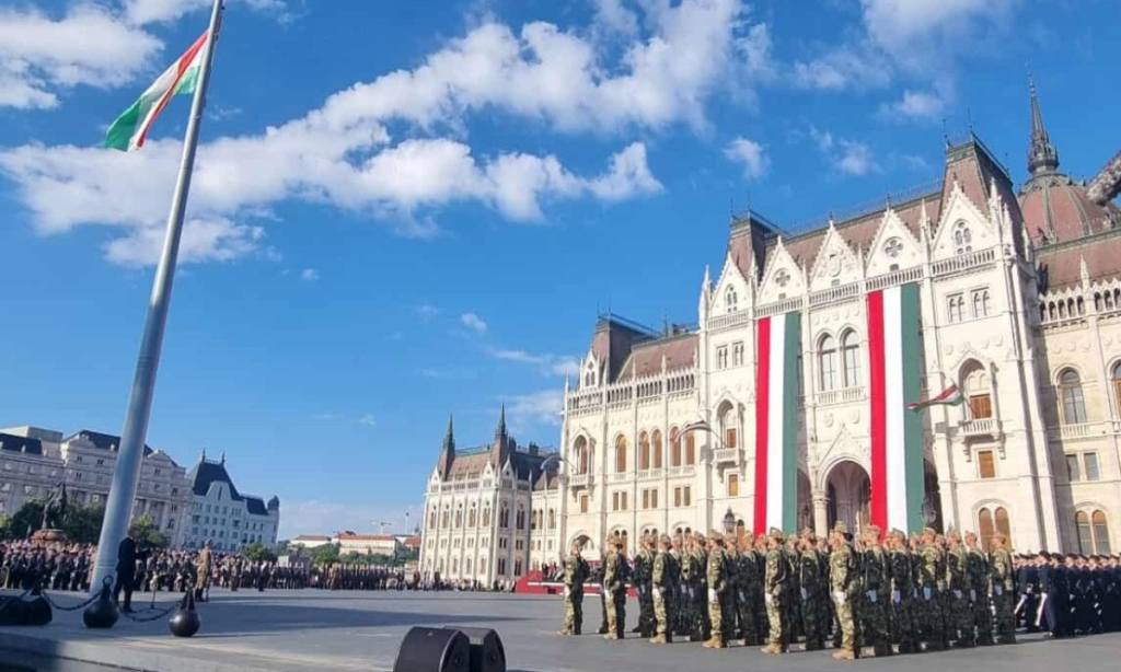 Katonai tiszteletadás mellett, Sulyok Tamás köztársasági elnök, a Magyar Honvédség főparancsnoka jelenlétében felvonták Magyarország nemzeti lobogóját az augusztus 20-i állami ünnepen, a Parlament előtti Kossuth Lajos téren.