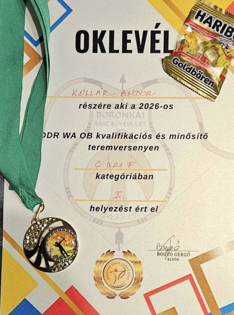 Már 2026 elején aranyérmet szerzett Kollár Andor. Több év végi balesetet követően Marcaliban lépett lőállásba tegnap a DDR WA OB kvalifikációs és minősítő teremversenyen, ahol az U21 férfi csigás kategória I. helyét szerezte meg 556 ponttal.