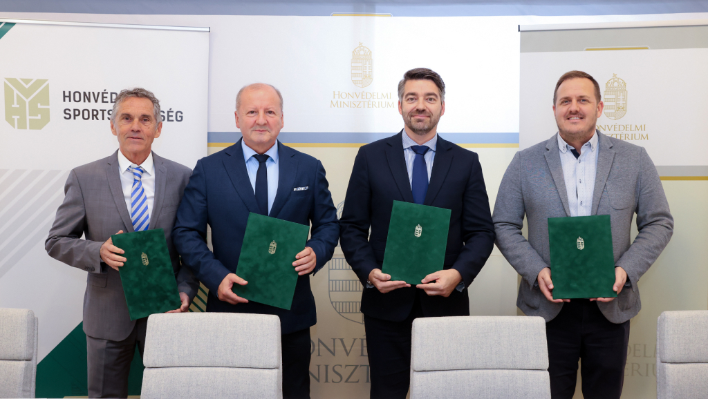 Képünkön balról jobbra: dr. Nébald György, a Honvédelmi Sportszövetség általános alelnöke, dr. Simicskó István, a Honvédelmi Sportszövetség elnöke, dr. Kutnyánszky Zsolt, a Honvédelmi Minisztérium haderőfejlesztésért és védelempolitikáért felelős államtitkára és dr. Czermann János, a Honvédelmi Minisztérium humánerőforrásért felelős helyettes államtitkára