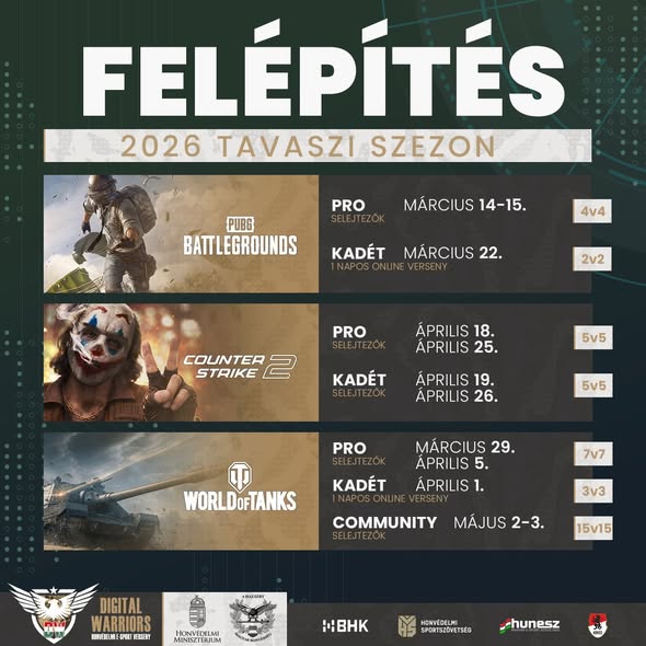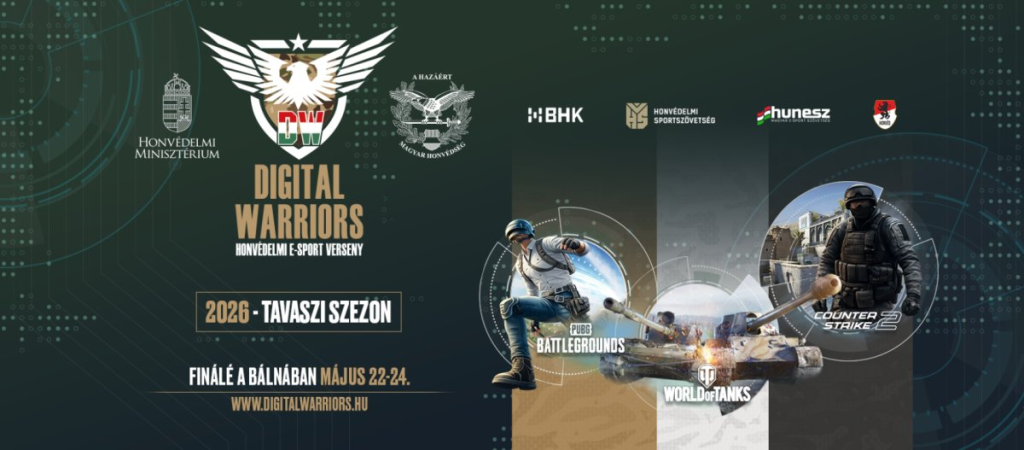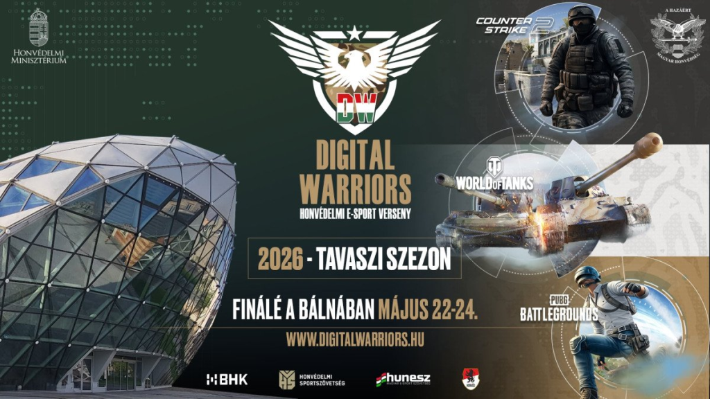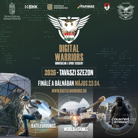 Megújult versenyformátumok a profiknak, több mint 500 iskola a kadét kupán! Érkezik a Digital Warriors 2026-os tavaszi szezonja. A Honvédelmi E-sport versenyeken ezúttal is Counter-Strike 2-ben, World of Tanksben és PUBG:Battlegroundsban várjuk a hazai gamereket. A nevezés továbbra is ingyenes az összes versenyre, a tét pedig több mint 5 millió forint értékű nyeremény! Az offline finálék házigazdája ezúttal is Bálna Honvédelmi Központ május 22-től 24-ig.